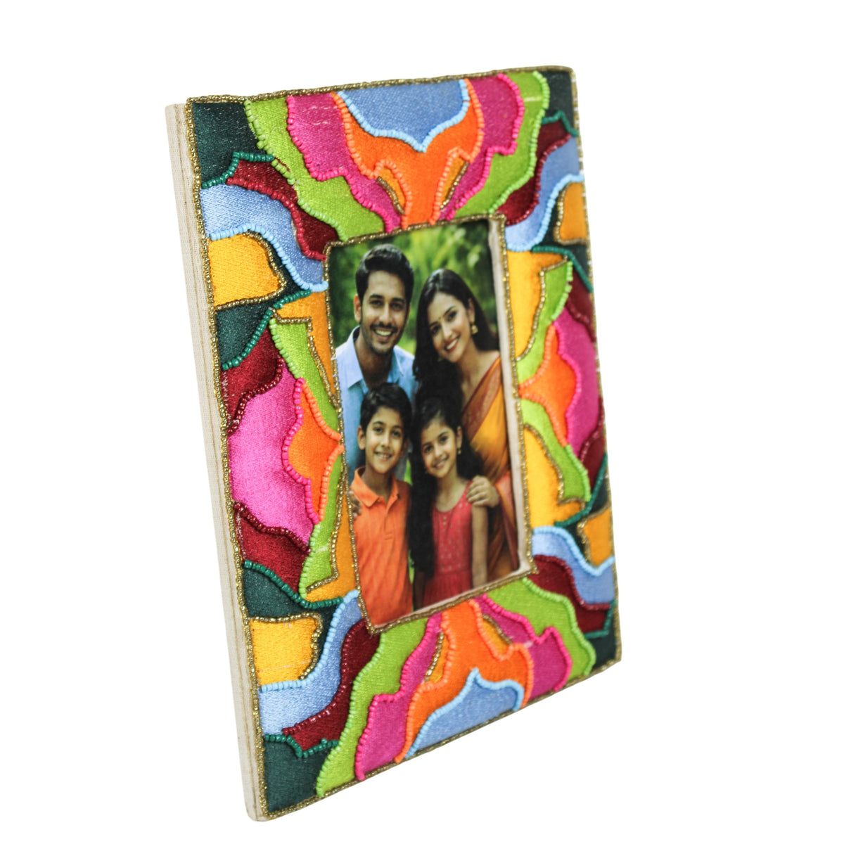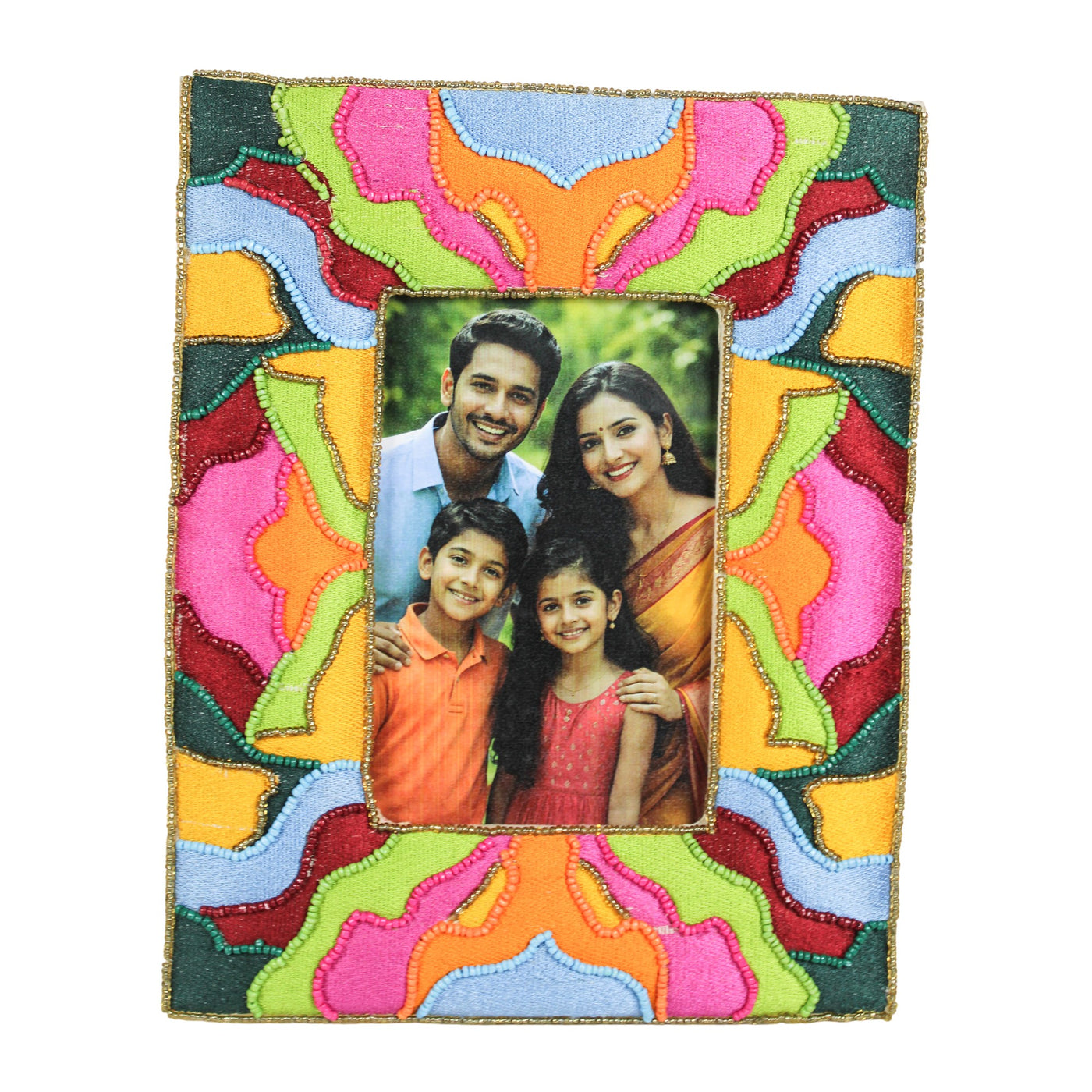 Brighten your favorite memories with this exquisitely detailed, hand-beaded photo frame. Featuring a vibrant, symmetrical floral pattern, this piece uses a rich palette of pink, orange, lime, and cerulean beads to create a stunning visual texture. Each line of beadwork is meticulously laid to frame your photos in a burst of color and craftsmanship. It’s more than a frame; it’s a piece of tabletop art.