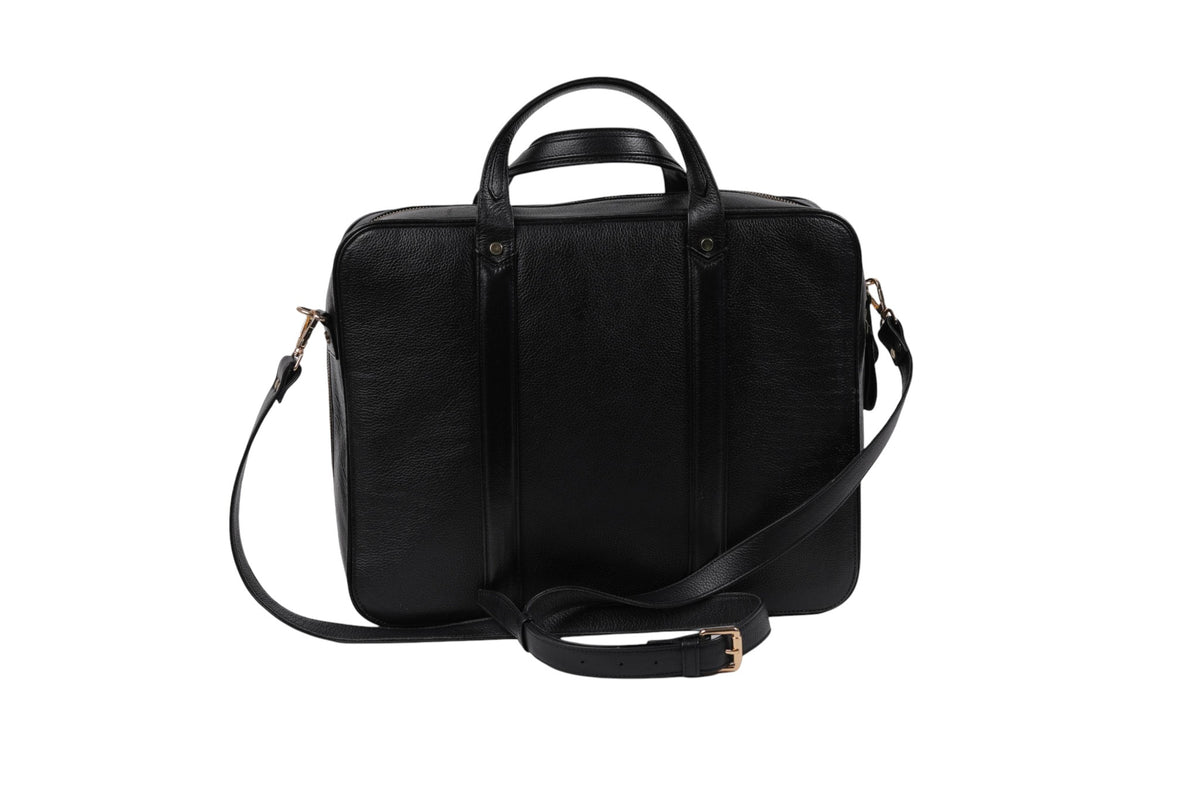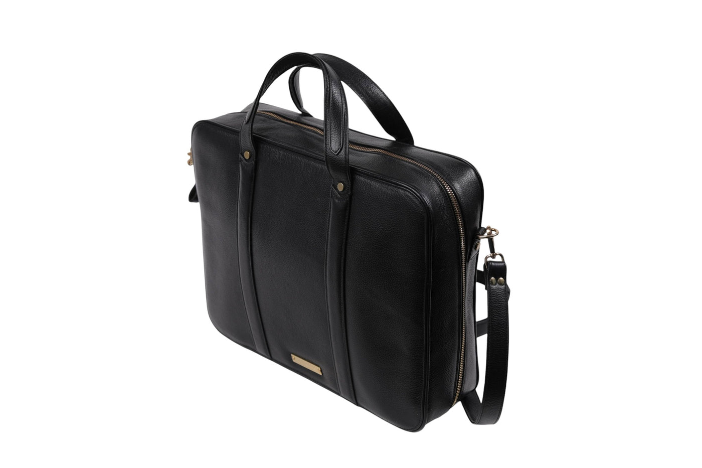 This laptop bag is made from genuine leather and a polyester lining. It has a structured design with two top handles, vertical accents on the front, and gold-tone hardware. The bag includes a padded laptop compartment two main zippered sections, an external pocket, and pockets for easy organization. It can be carried by the handles or with the adjustable, detachable, padded shoulder strap. .