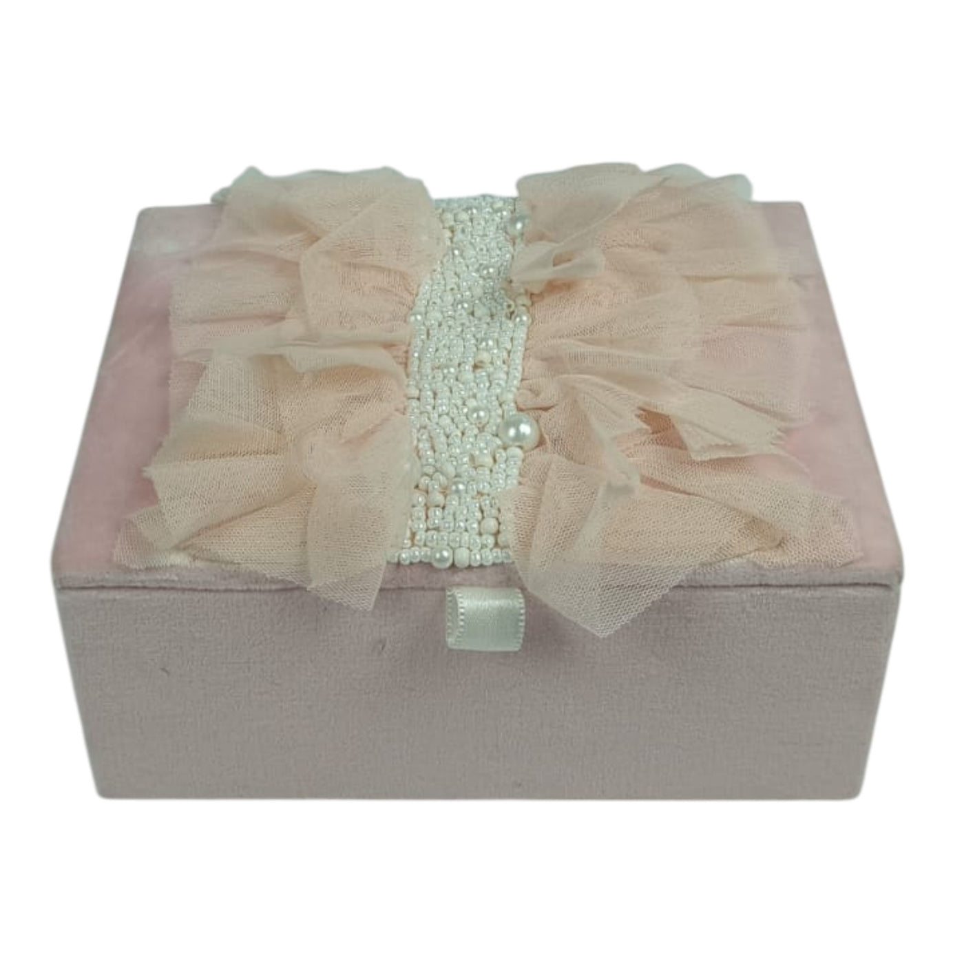 Texture: Soft-touch blush pink velvet body with a delicate tulle ruffle overlay on the lid.
