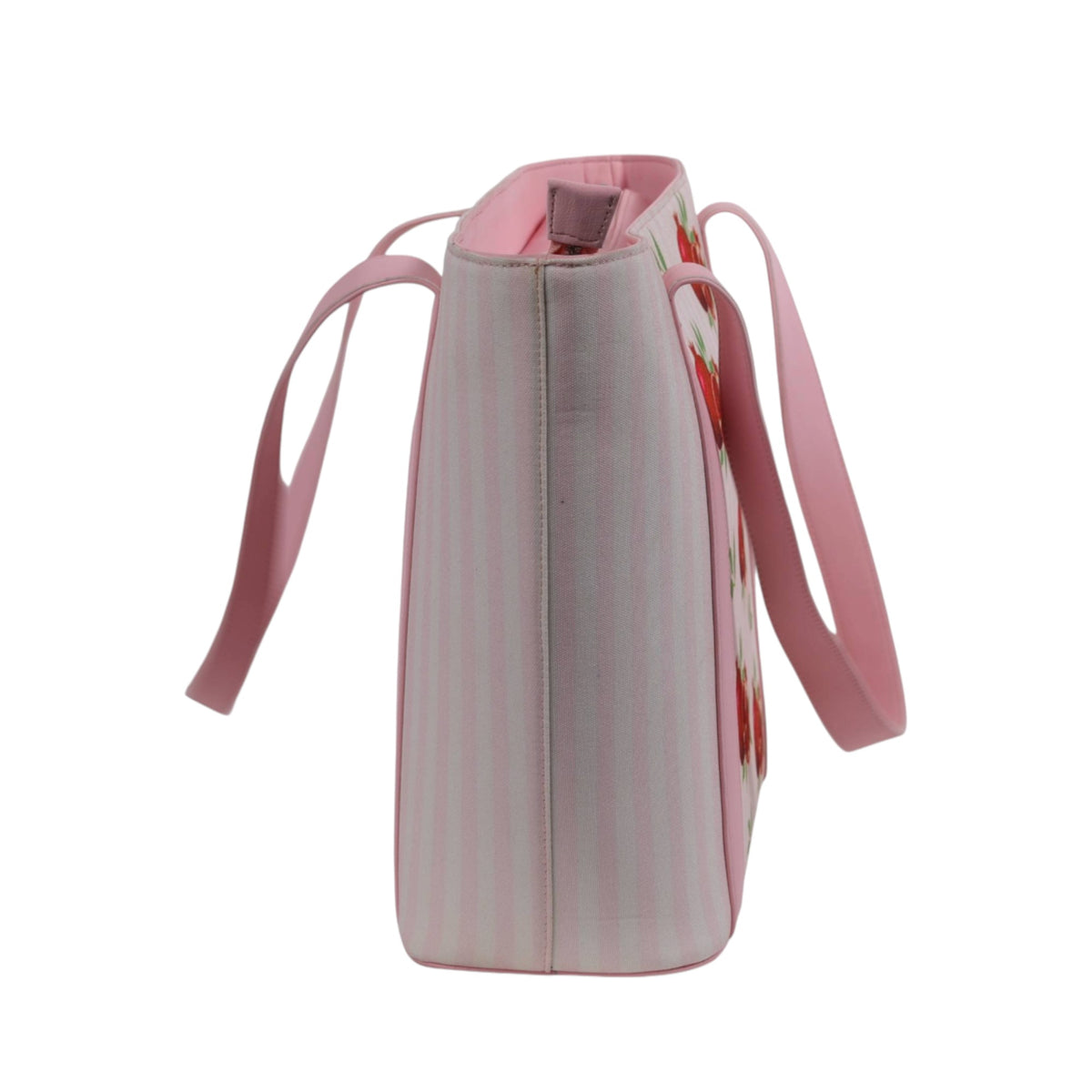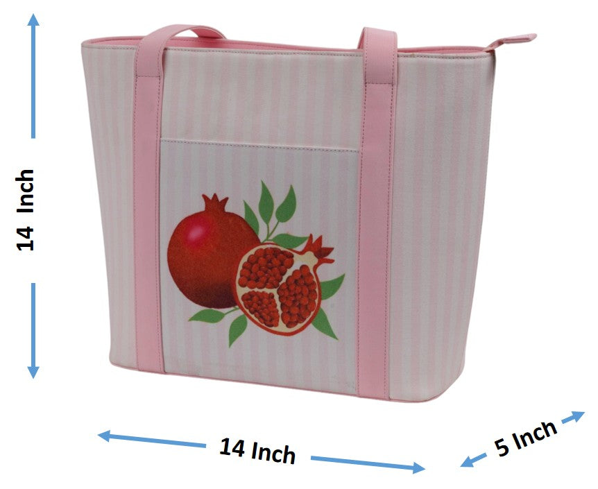 This cotton canvas tote bag features a decorative pomegranate print with a white or off-white central panel showcasing a repeated pattern of red pomegranates and green leaves. The side panels are designed with pink and white vertical stripes, adding a soft and playful contrast. Typically made from cotton canvas or other durable, eco-friendly fabrics, this bag combines practicality with style. Its casual, aesthetic design makes it ideal for everyday use, including shopping, market visits. Additionally, it serves as a modern gift idea and a sustainable accessory choice.