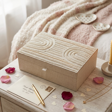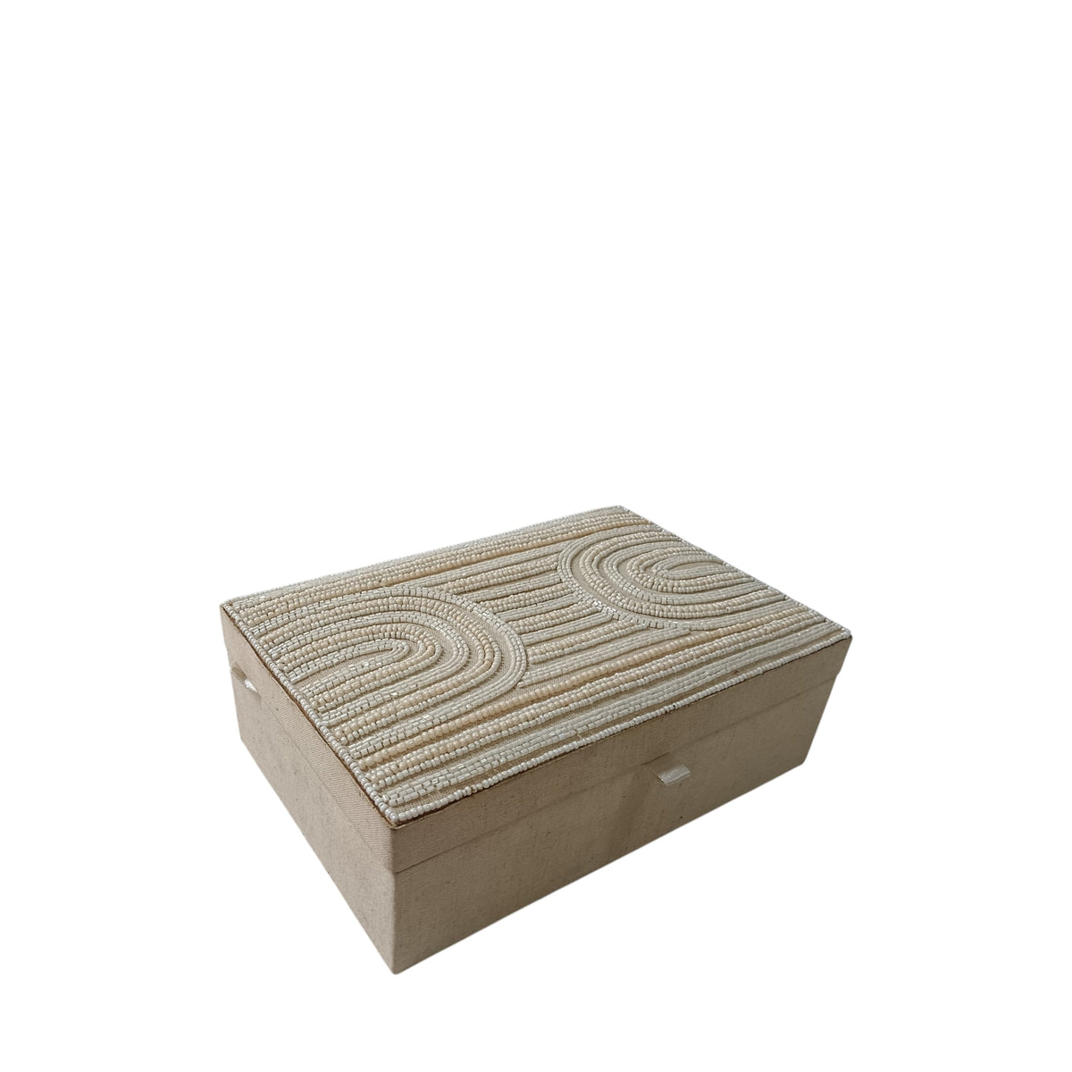 Discover the perfect blend of texture and tradition with our handcrafted beaded jewelry boxes. Each piece features a meticulously hand-applied seed bead pattern on the lid, creating a beautiful 3D effect. The cream-toned glass beads are arranged in sophisticated concentric arcs and linear rows, offering a serene, tactile experience.