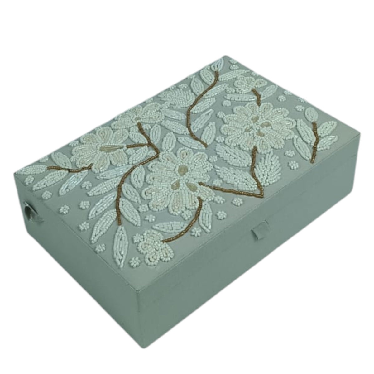 Design: A complex hand-beaded floral design with delicate leaf accents and three large white blooms connected by golden-brown beaded vines.