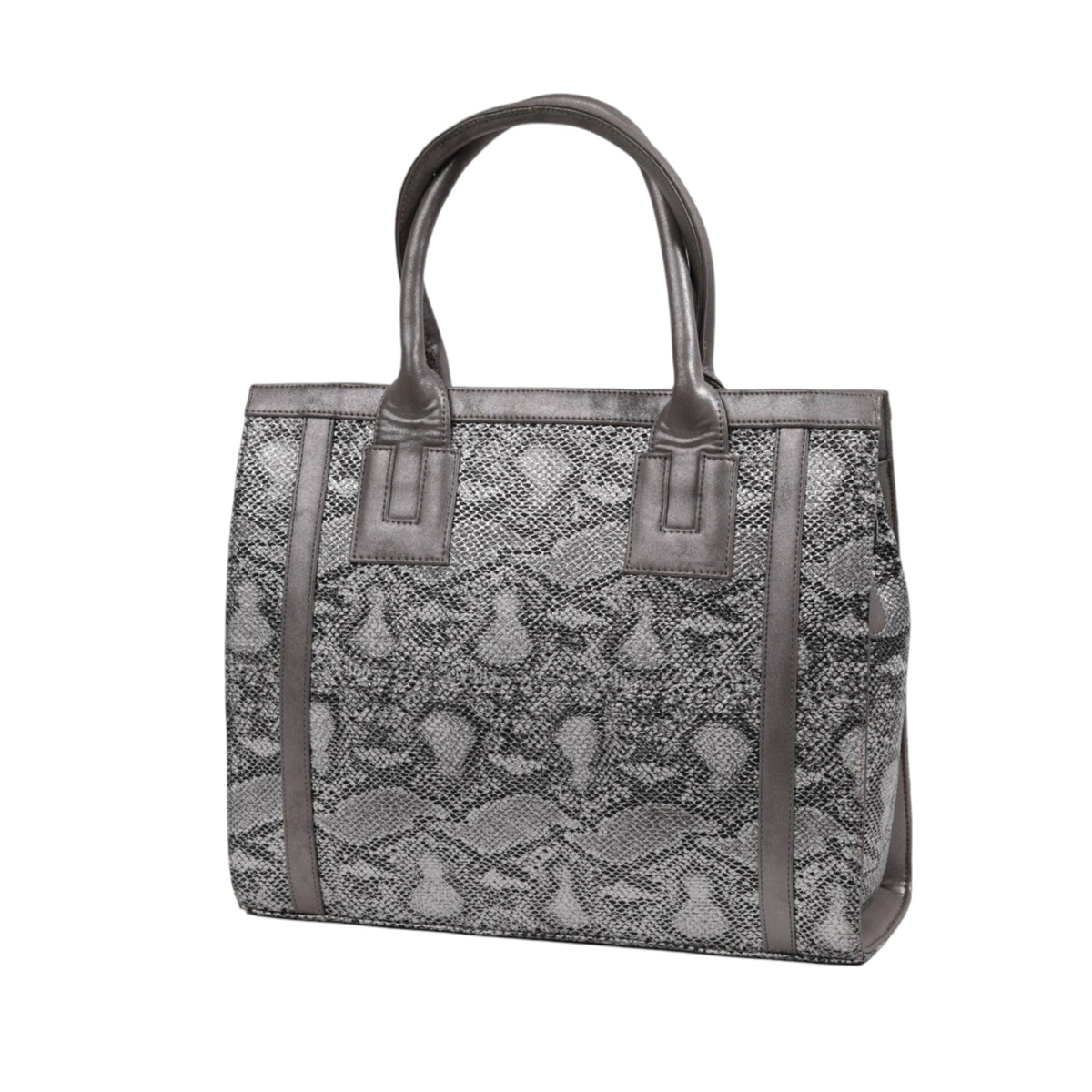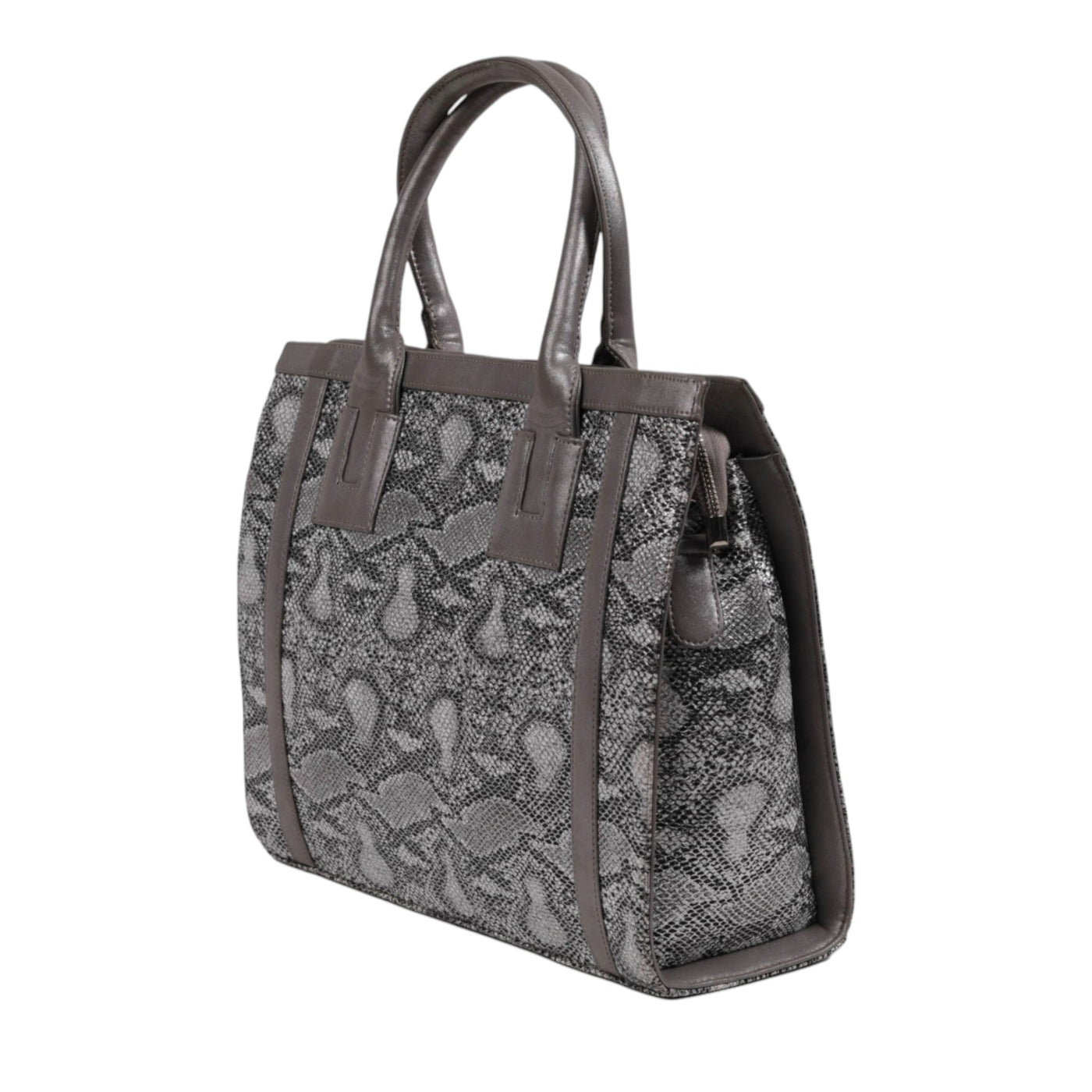 This grey textured handbag is made from high-quality PU . Some premium versions use genuine leather. The bag features a black-and-grey or black-and-silver snake pattern, grey or silver piping, and matching top handles. Its structured, boxy shape makes it great for work, including as a laptop bag or office tote. Inside, it has a main compartment with pockets for organization. Stylish and practical, this handbag is perfect for everyday use, professional settings, or casual outings.