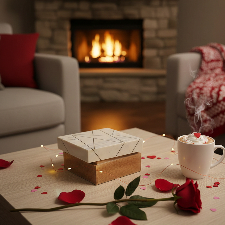 Cozy living room with a fireplace, coffee cup, gift box, and rose on a table.