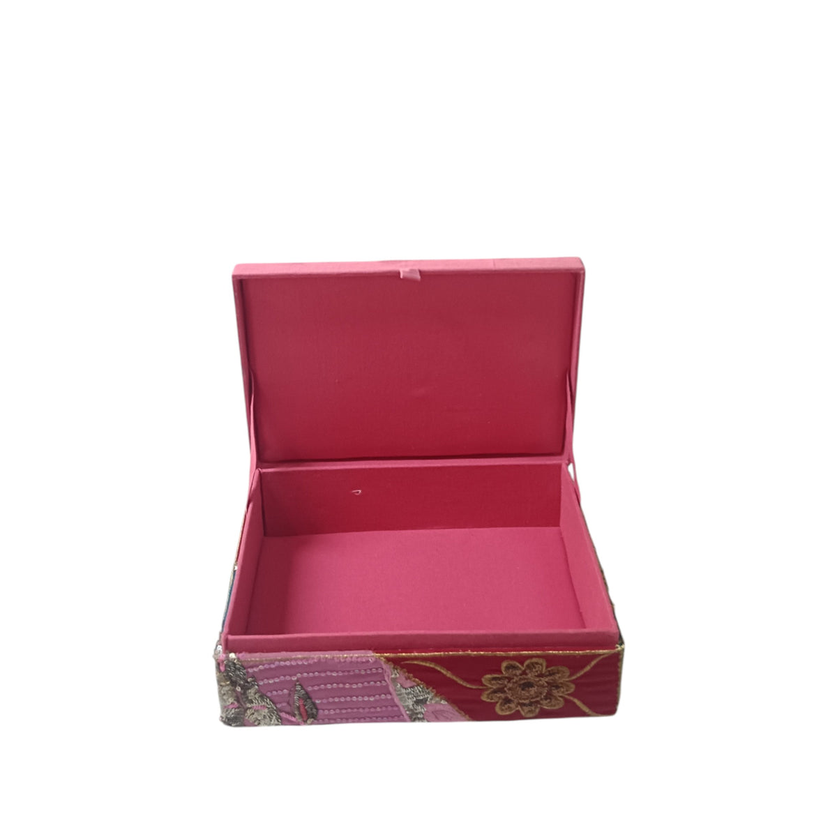 Intricate Detailing: The lid and sides are decorated with floral and paisley motifs, highlighted by hand-stitched beads and metallic accents that catch the light beautifully.