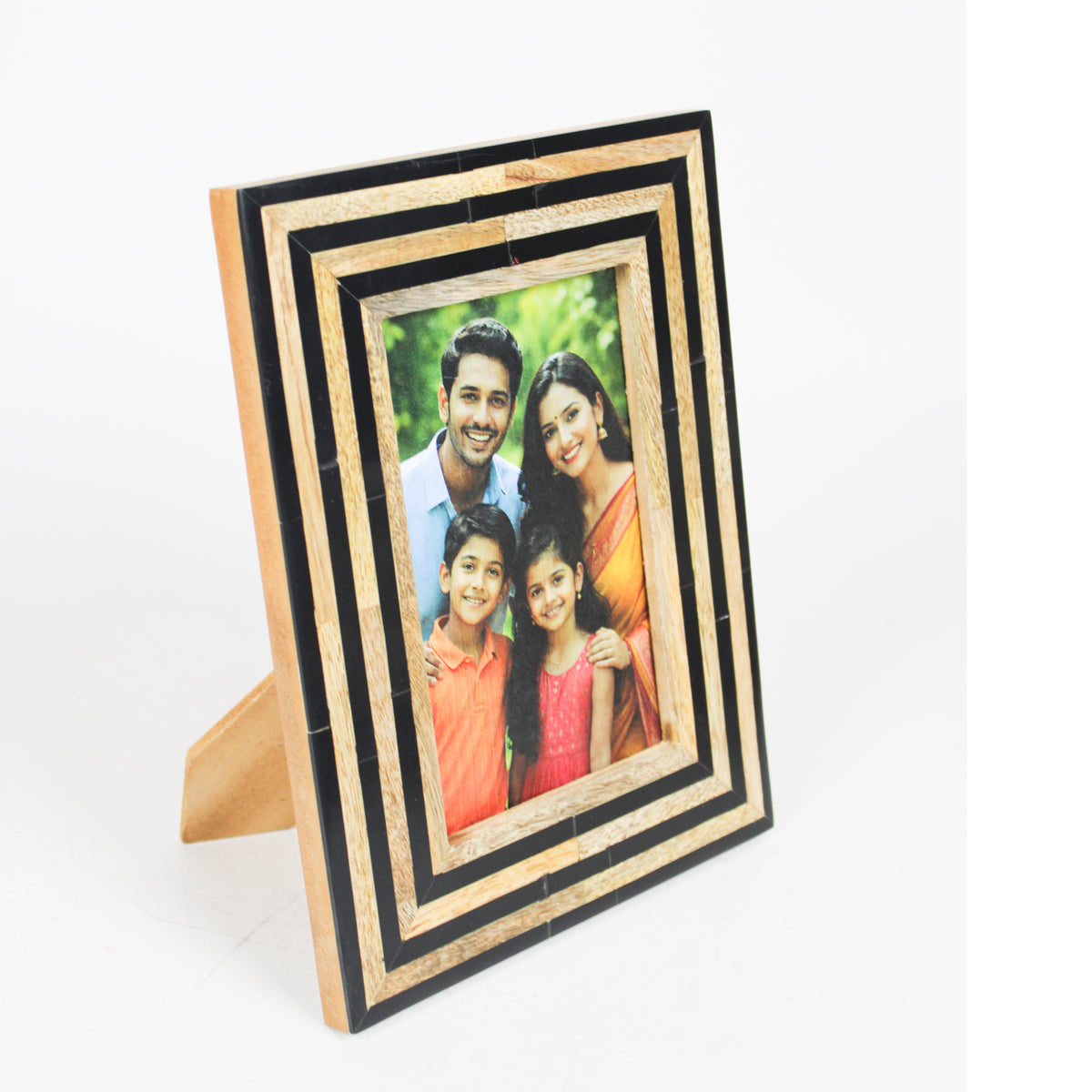 Geometric Precision: The alternating bands of light wood and black inlay create a rhythmic, concentric pattern that draws the eye toward your photograph.