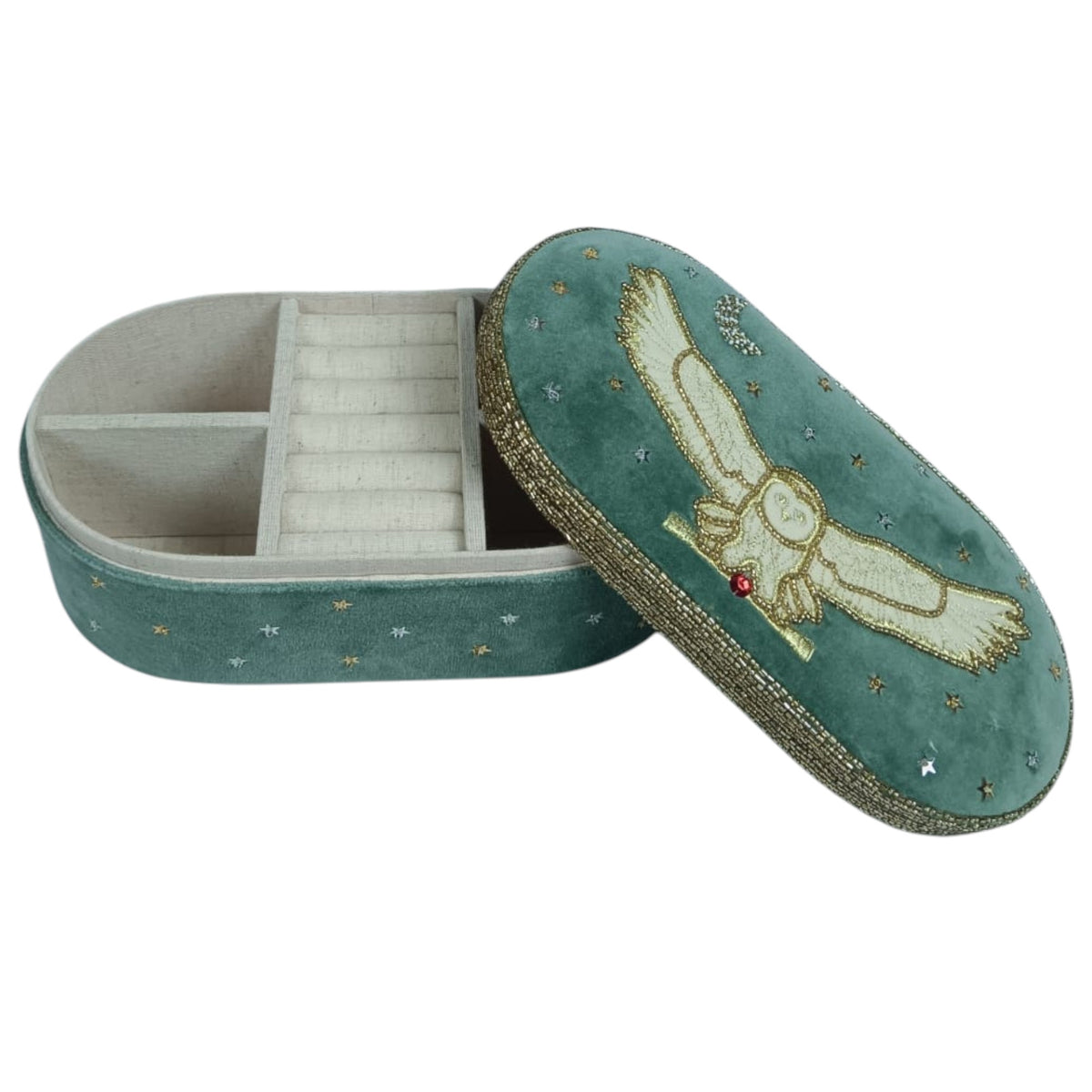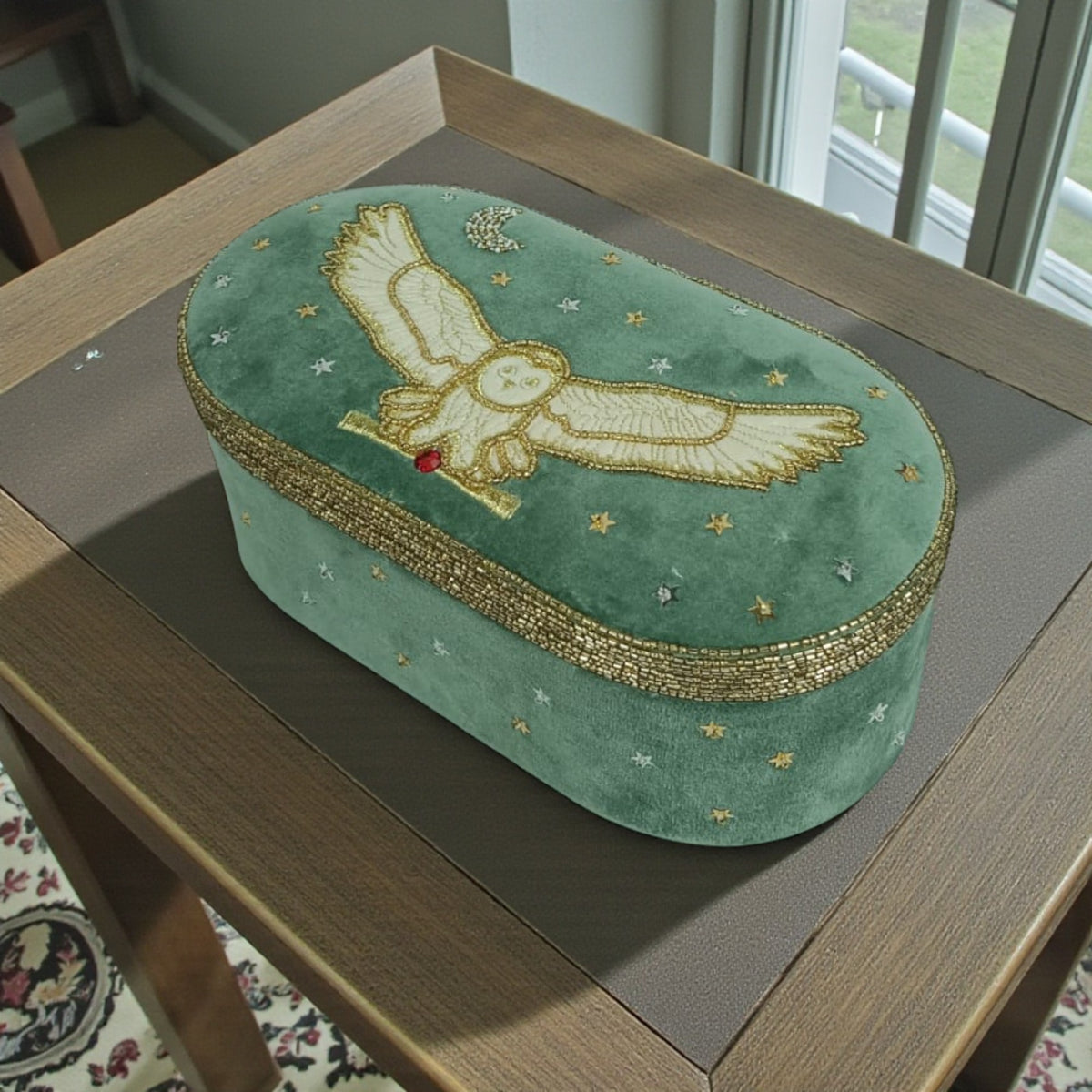 Details: Finished with a thick gold beaded border around the lid and a small red jewel accent on the owl.