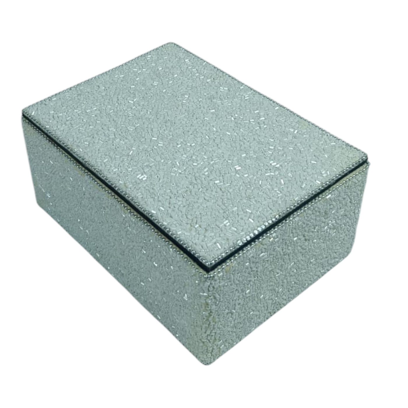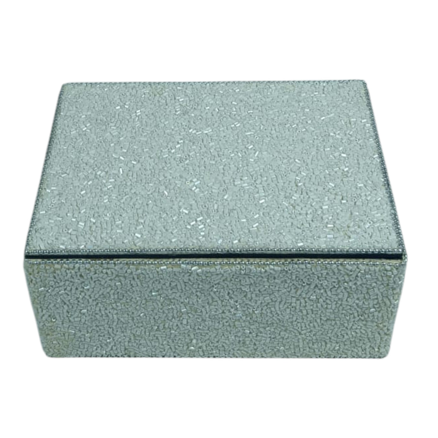 Design: The entire box is covered in thousands of tiny, shimmering silver and white seed beads that catch the light.