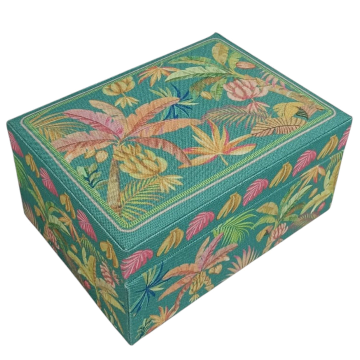 Pattern: Vibrant tropical leaf and floral motif with palm fronds and hibiscus-inspired tones.