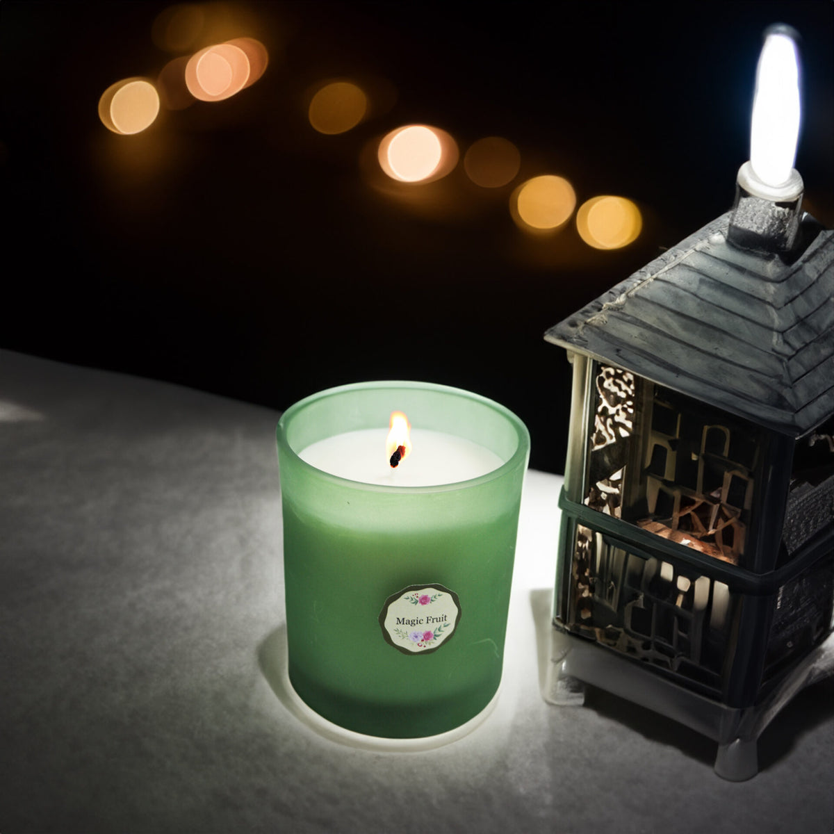 Frosted Glass Green Jar Candle 180 gms Magic Fruit for Gift & Home Decor