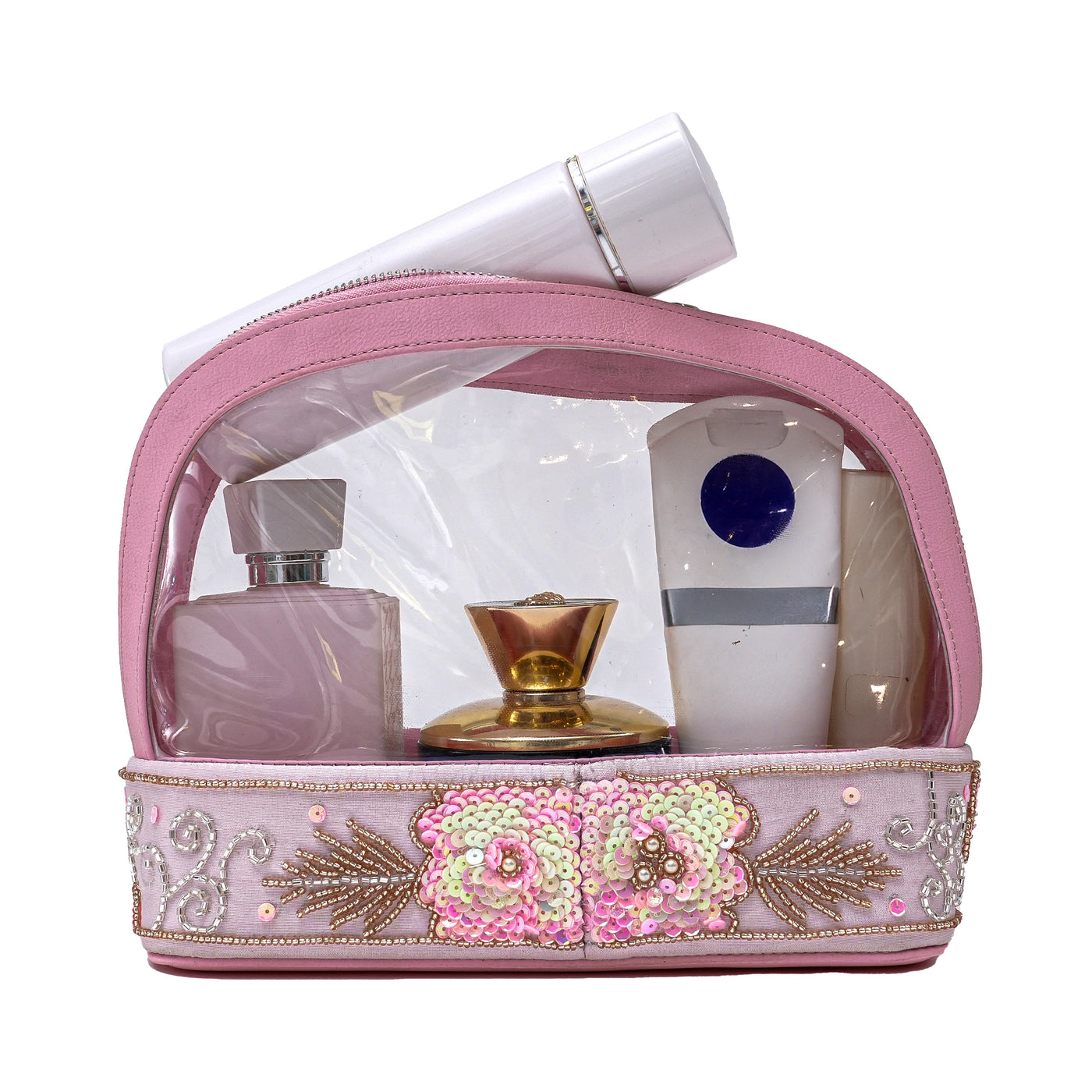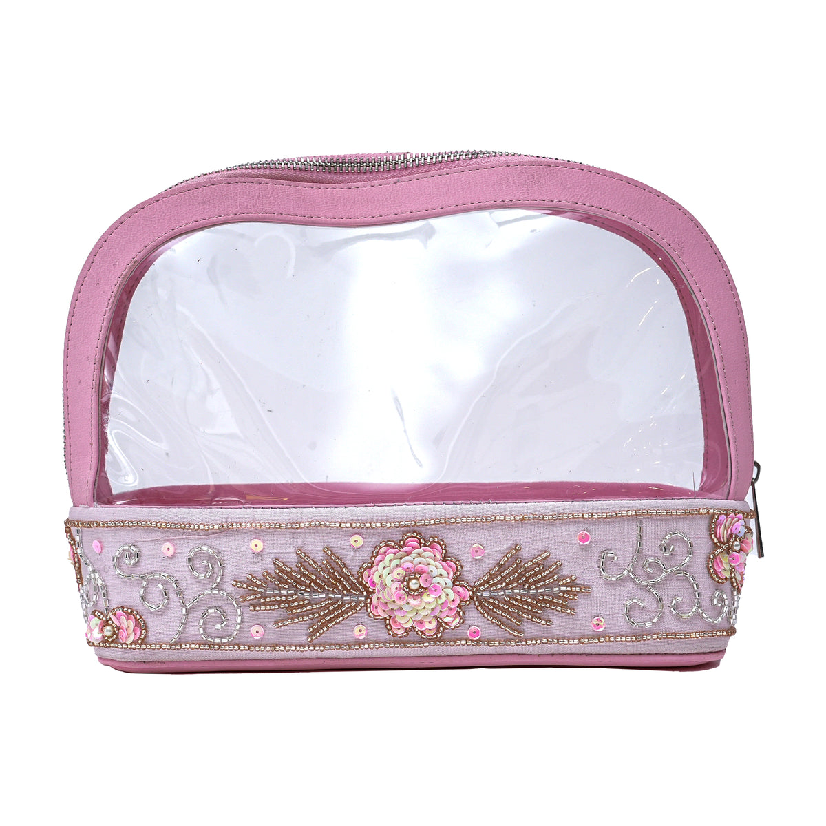Beautiful Hand Embroidered pink PU Leather Pouch. Perfect Valentine Gift. It can be used for keeping Makeup, Jewelry and your precious things.