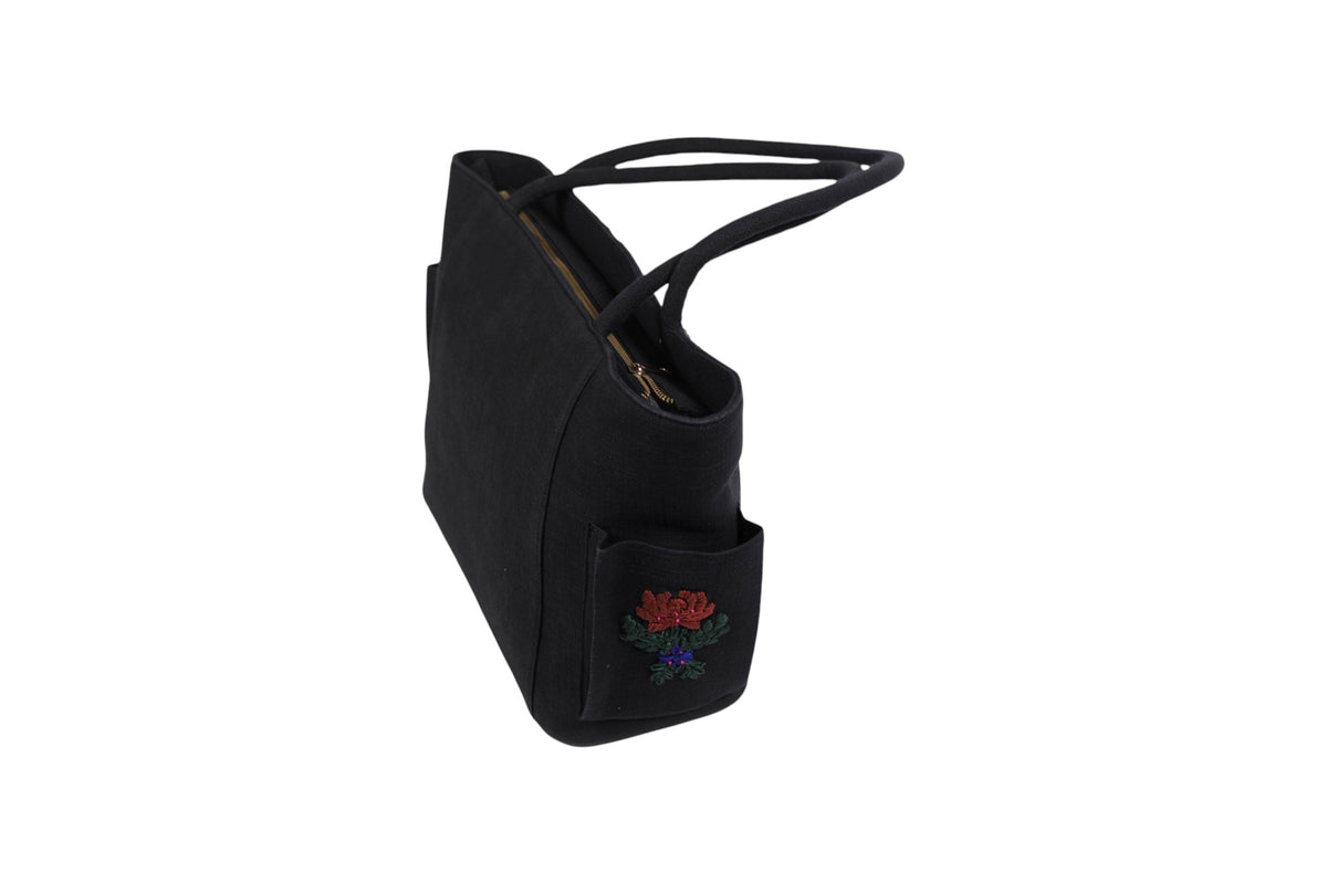 This black tote bag features vibrant embroidery, two sturdy handles, and exterior slip pockets on both sides. Made from durable black cotton canvas, it is stylish, practical, and perfect for carrying essentials with a unique handcrafted touch.