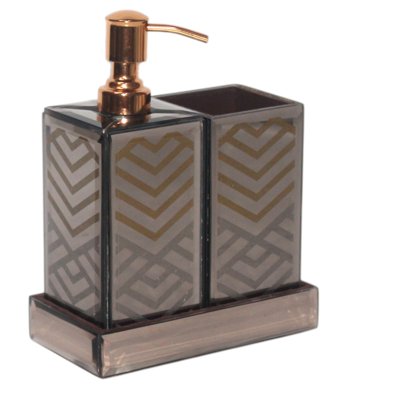 Add a luxurious touch to your bathroom with this elegant set, including a Tray, Soap Dispenser, Toothbrush Holder with a Small Tray.