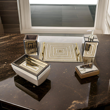 Add a luxurious touch to your bathroom with this elegant set, including a Tray, Soap Dispenser, Soap Dish, Toothbrush Holder and Multipurpose Small Tray