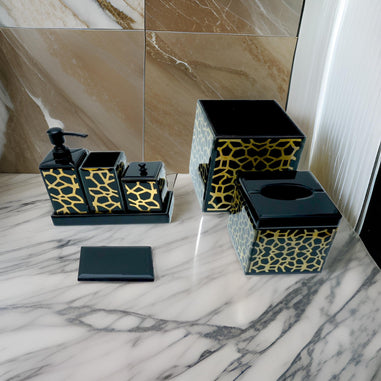 Add a luxurious touch to your bathroom with this elegant set, including a Soap Dispenser, Soap Dish, Toothbrush Holder, Dust Bin / Plant pot holder, Small Tray, and Powder Box with Lid.