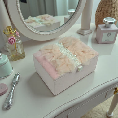 Texture: Soft-touch blush pink velvet body with a delicate tulle ruffle overlay on the lid.
