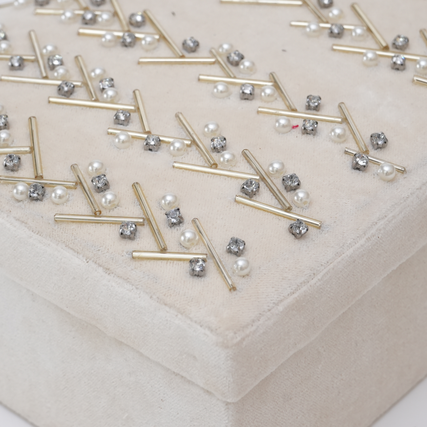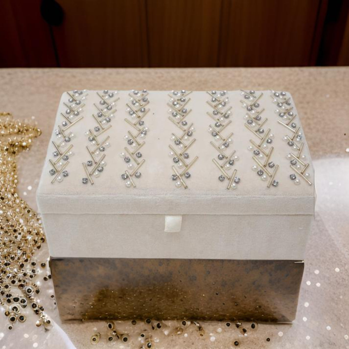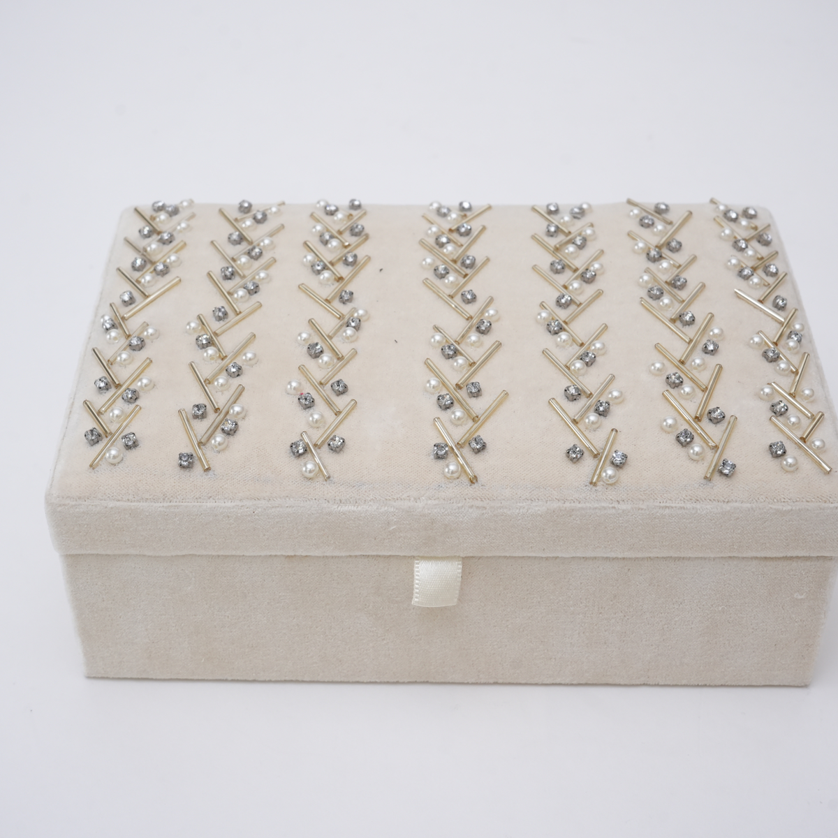 This exquisite Jewellery box is a timeless piece of art, adorned with intricate hand embroidery of a blooming design. A perfect gift for loved ones or a luxurious treat for yourself, this Jewellery box combines aesthetic charm with practicality.