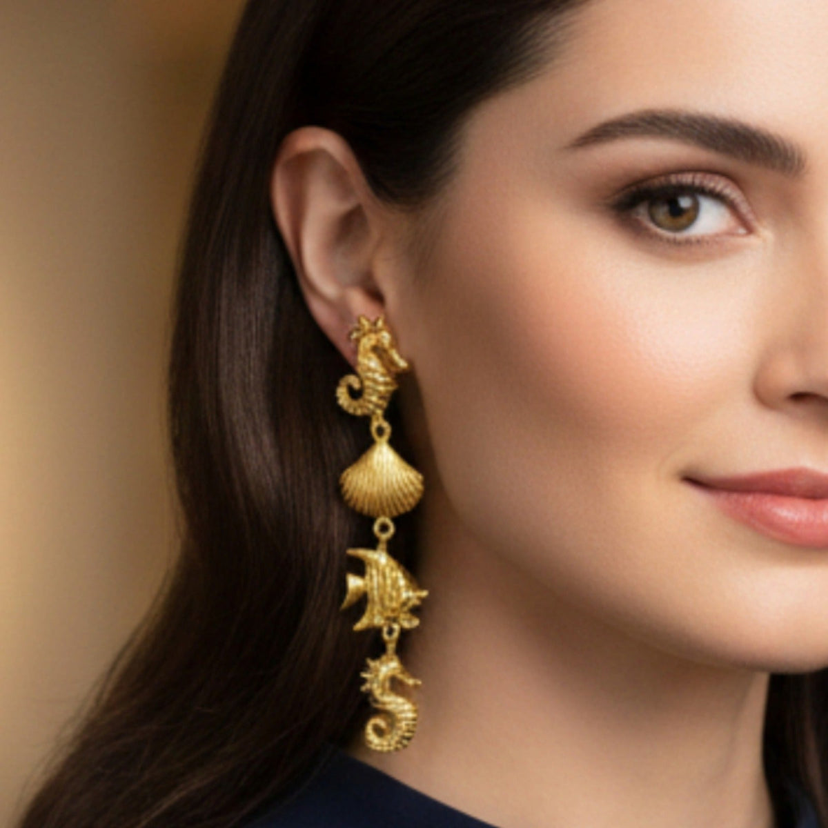 Design inspired from the ocean. These gold electroplated dangler earrings feature intricately crafted related to ocean, including seahorses, fish, and shell elements. Each charm is carefully linked to allow gentle movement, adding a subtle sense of playfulness while maintaining an elegant look.
