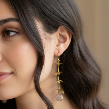 Gold Electroplated Wine colour Austrian crystal Danglers, DESCRIPTION-Gold electroplating, giving them a rich, buttery yellow-gold luster that resists tarnishing. Fish Hooks with petal-like golden accents, Perfect for garden weddings, bridesmaid jewelry, or elevated daytime wear. Comfortable for all-day wear.