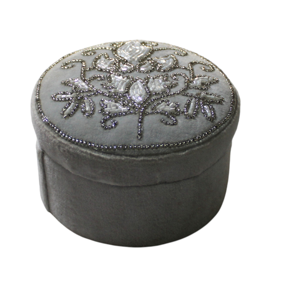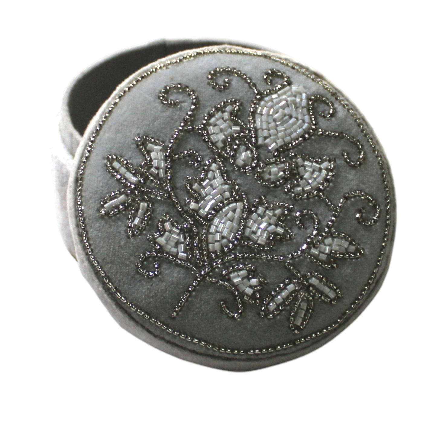 Hand-Beaded Floral Velvet Jewelry Box – Dove Grey & Silver