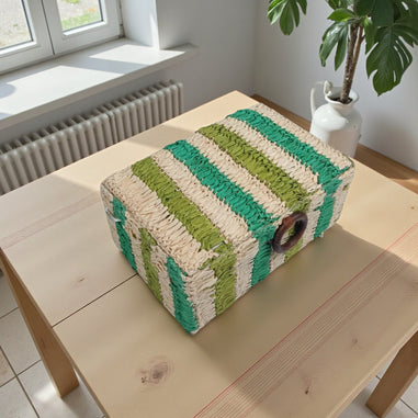 Design: Decorated with bold, vertical stripes in bright green, lime green, and off-white/cream.